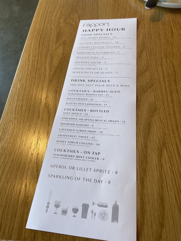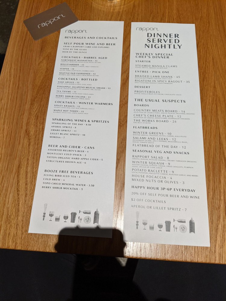 Rapport is a trendy tapas and small plates breakfast & brunch spot located in Seattle's Capitol Hill area. The restaurant offers a unique self-pour wine experience with electronic cards to track your pours. Customers praise the variety of dishes, from creamy spreads on chef's cheese board to flavorful margarita flatbread. The strawberry shortcake is also a standout dessert. The happy hour specials are popular, with frozen cocktails and fruit drinks on tap. The service is friendly and knowledgeable, making for a pleasant dining experience. The ambiance is described as cute and nestled, away from the busy city noise. Overall, Rapport is well-known for its delicious food, great wine selection, and casual yet classy atmosphere, perfect for group gatherings or date nights.